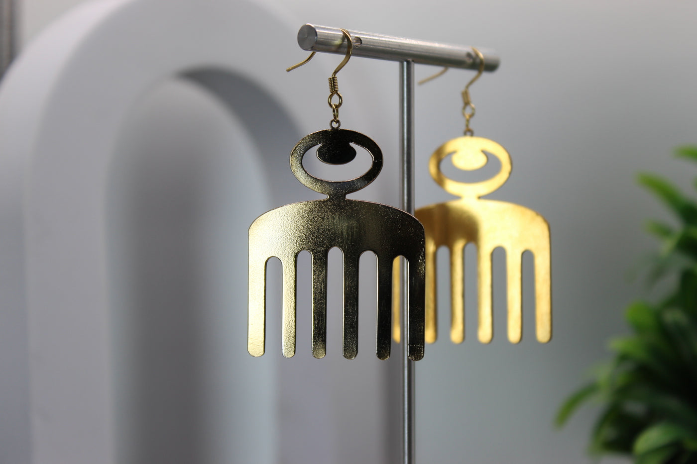 Inspired by the traditional Duafe comb symbol of beauty and femininity, these stunning gold-plated earrings bring a touch of cultural elegance to your everyday look. The intricate comb design catches the light beautifully, making them perfect for adding personality to any outfit. Whether you're dressing up for a special occasion or elevating your casual style, these earrings celebrate heritage with a modern twist. Lightweight and comfortable for all-day wear, they're your new go-to accessory for making a meaningful statement.
